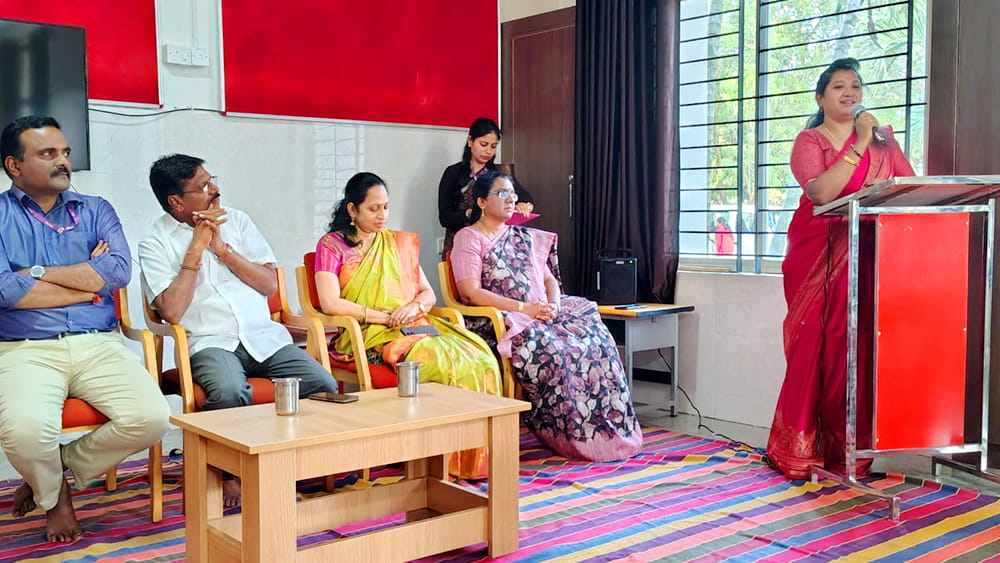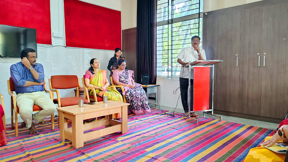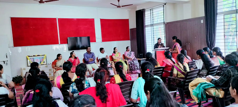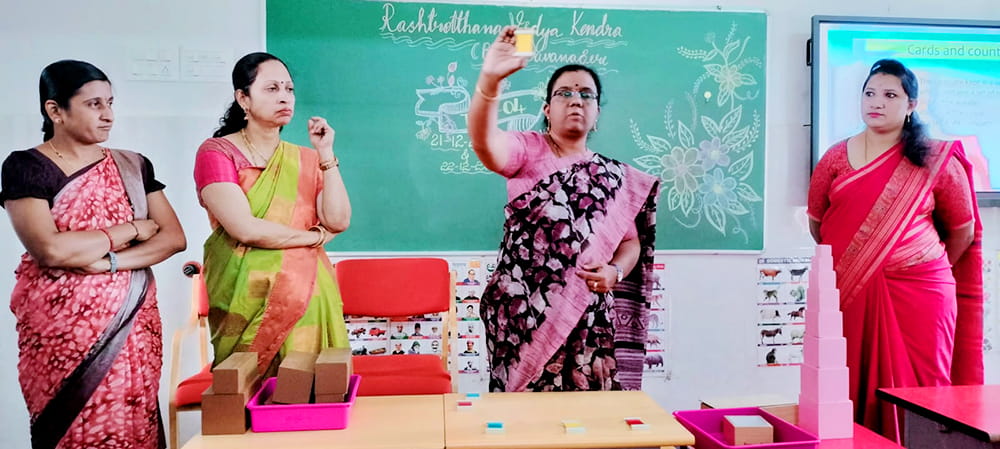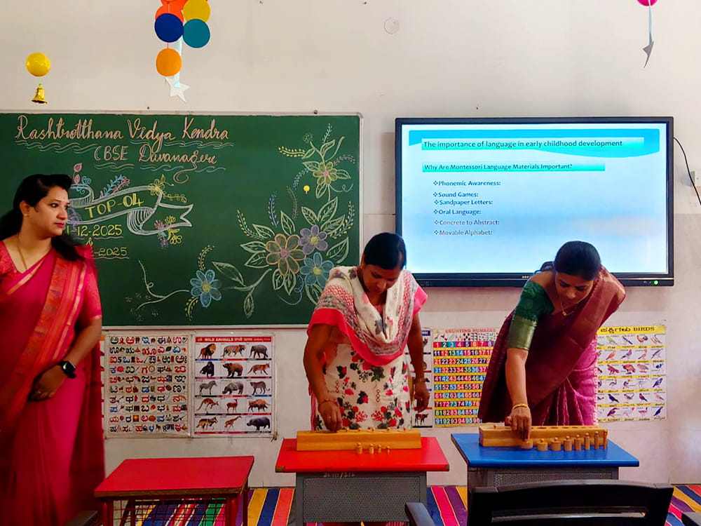 Davanagere, Dec. 22: A teacher orientation programme was conducted herein Rashtrotthana Vidya Kendra – Davanagere with the aim of enhancing the professional skills, personal growth and understanding of child development of teachers.The sessions focused on training on Montessori materials conducted by Smt. Gautami and Smt. Madhulika. Where teachers focused on the effective use of learning tools to promote practical, child-centred education. The sessions emphasized on creating an engaging and developmentally appropriate classroom environment. Another important session was on understanding child behaviour and development. This session provided valuable insights into the mental and emotional needs of children at different developmental stages. It helped teachers to better support students in their learning journey. The session was conducted by Smt. Vani and Smt. Gayatri. The special session titled “Inner Journey – Personal Growth and Emotional Balance for Teachers” highlighted the importance of self-awareness, emotional stability and mental well-being in the teaching profession. Teachers were encouraged to reflect on their inner growth to become more effective, compassionate and balanced teachers. The session was conducted by Smt. Gautami Math and Smt. Gayatri Math. In his closing remarks, Secretary Sri Jayanna urged teachers to uphold dedication, values and commitment in their profession.