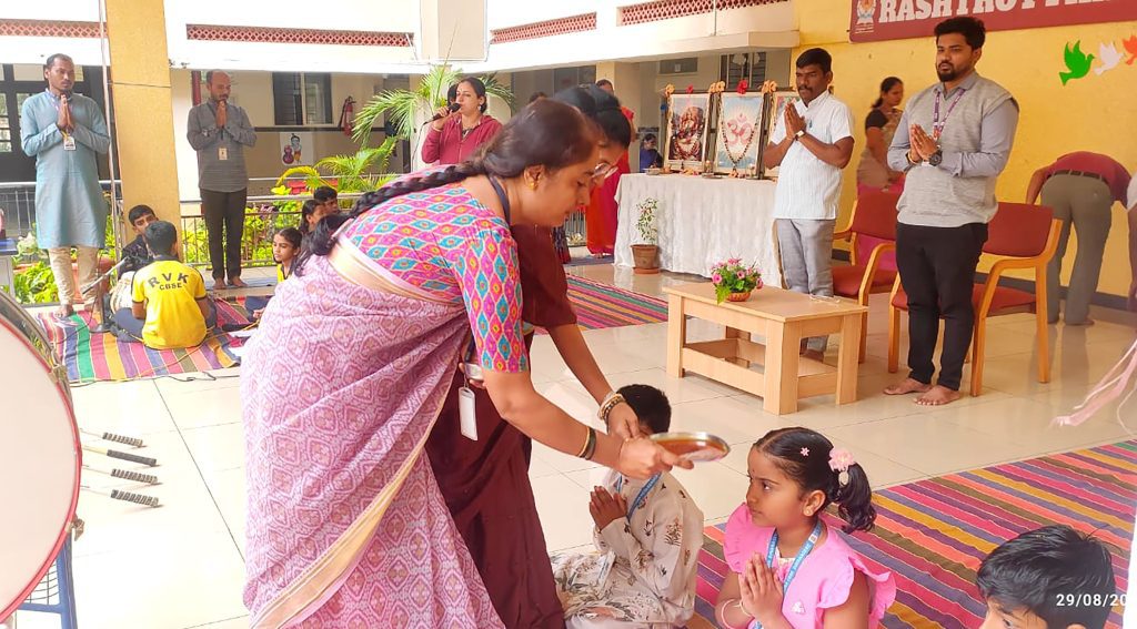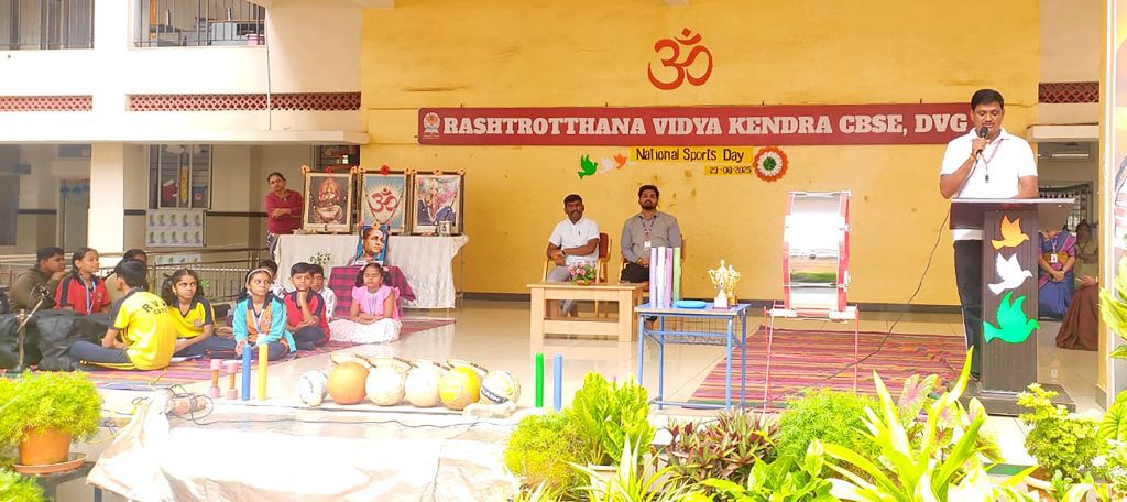 Davangere, Aug. 29: National Sports Day was celebrated herein Rashtrotthana Vidya Kendra – Davanagere. Vibha C. H., a student of class 6, explained the importance of National Sports Day and gave comprehensive information about the life and achievements of the “Hockey Wizard” Major Dhyan Chand. Physical Education Teacher Sri Hanumana Gowda spoke about the benefits of sports.