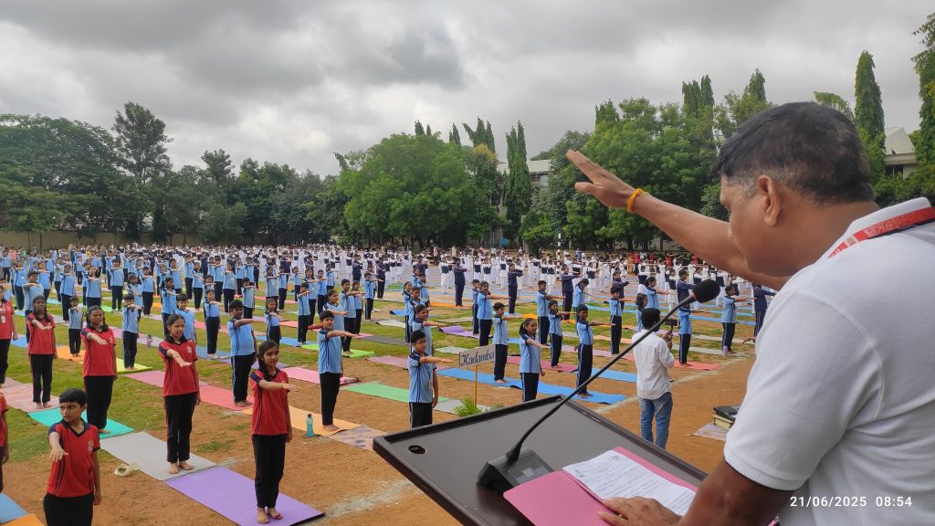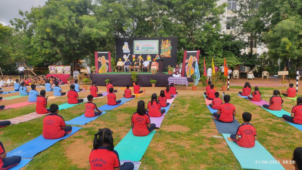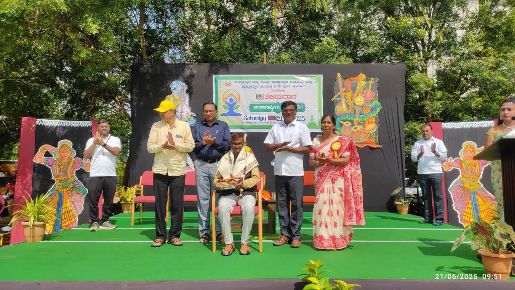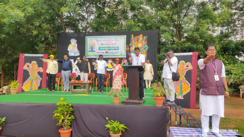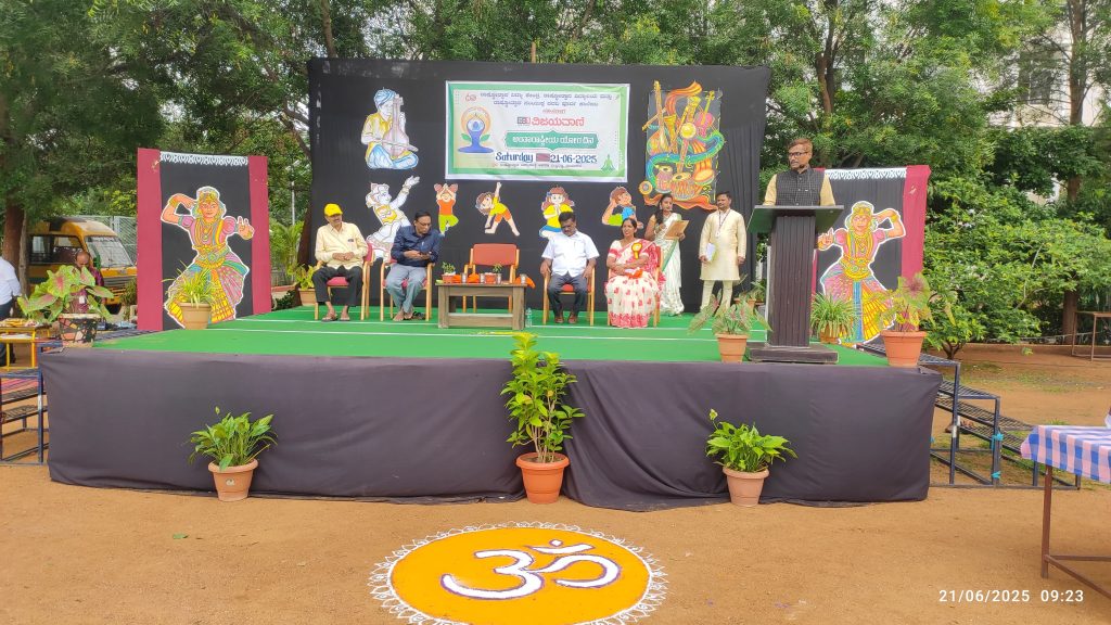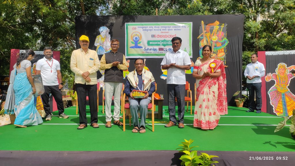 Davanagere, June 21: Rashtrotthana Vidya Kendra – The 11th International Yoga Day and World Music Day were celebrated in Davangere in collaboration with Rashtrotthana Vidya Kendra, Rashtrotthana Vidyalaya and Rashtrotthana Samyukta Purva College, Vijayavani Daily. Dr. Mallikarjuna Dambal graced the program. In the program, the administrative head and secretary, Sri Jayanna, gave the introductory remarks and remembered Patanjali Muni and said that yoga is very important for a healthy and fit life, keeping the mind and body strong. He conveyed his best wishes to everyone through the Rashtrotthana Parivar. Yoga demonstrations like meditation, pranayama, and surya namaskar were conducted for the children under the leadership of yoga teacher Smt. Geeta. The Chief Guest spoke about the types of Ashtanga yoga, healthy lifestyle, meaning of asanas, importance and background of yoga, and let us move towards a sustainable life through yoga. He emphasized the motto of yoga, ‘One land, one health’. Sri Naveen M. B., Editor of Vijayavani Newspaper, spoke and said that yoga is a valuable contribution of our Indian culture, it relieves stress, increases concentration and strength and that we should make yoga a practice in our daily life.