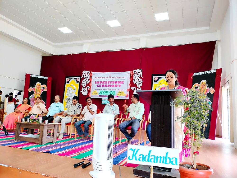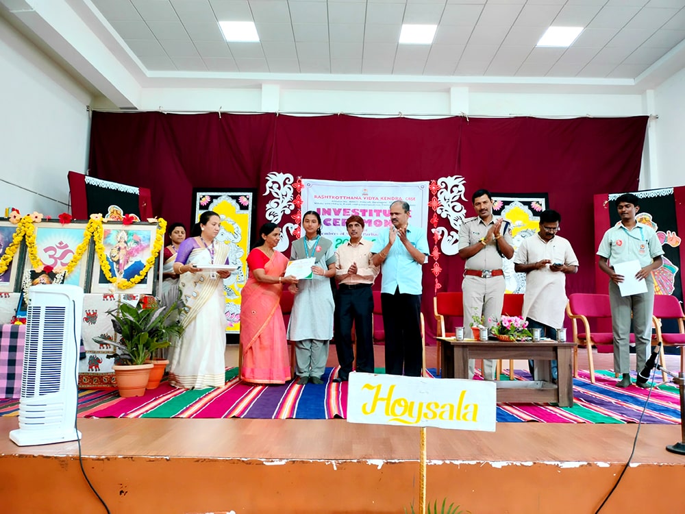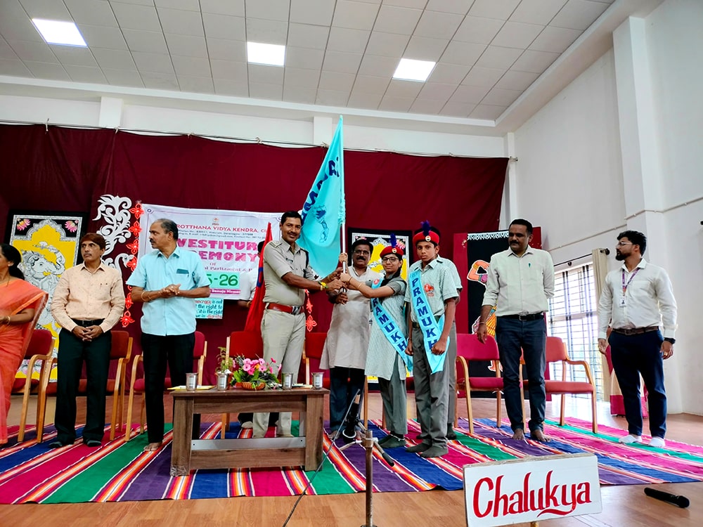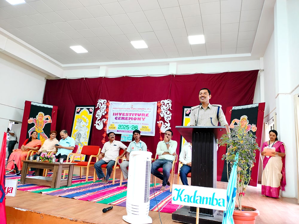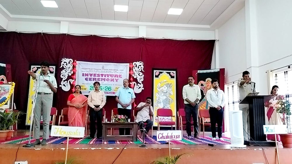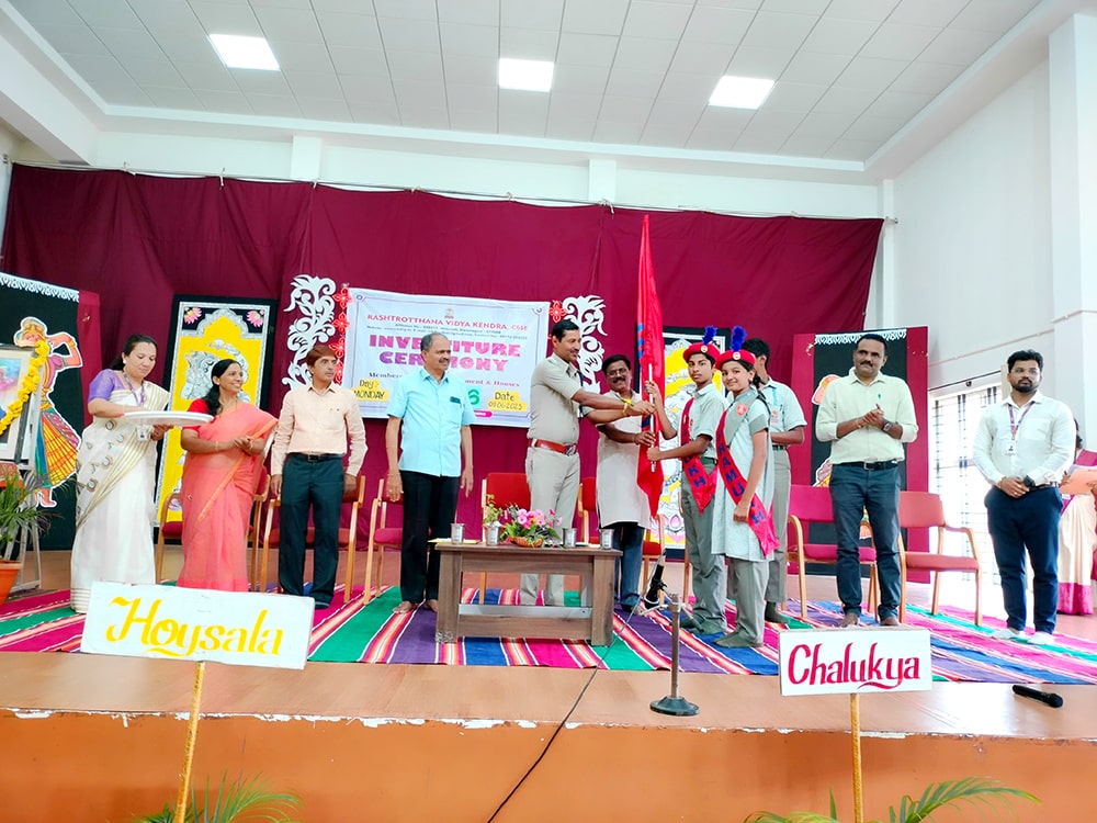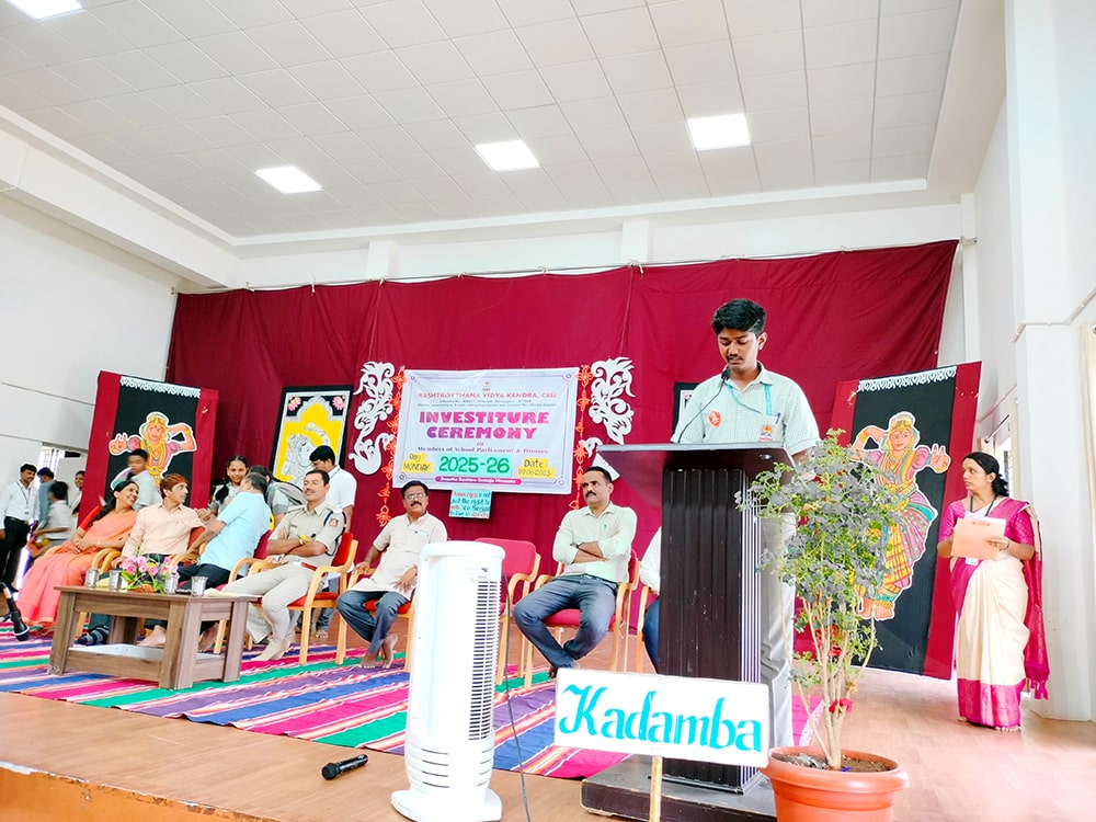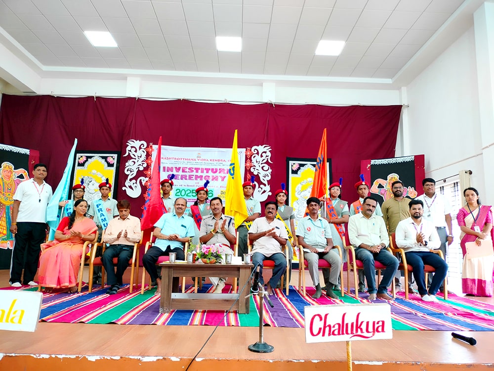 Davanagere, June 9: The oath-taking ceremony was held herein Rashtrotthana Vidya Kendra – Davanagere. The Chief Guest was Sri Prakash P B, DySP, Davanagere. A Prasthavik report highlighting the importance of student governance and the election process and a detailed reading by Sri Manjunath S. were held. An election video demonstration was presented demonstrating the smooth and transparent conduct of the School Parliament elections. The oath-taking ceremony was led by the student leaders, who took a pledge of integrity, responsibility and commitment to leadership. The badging ceremony was held. The elected student representatives were felicitated with badges and sashes by the Chief Guest and dignitaries. The newly elected Vice President, Sri. Dhanush C. Gowda, delivered a speech on behalf of all the student leaders and assured them of serving the school with honesty and dedication. Sri. Santosh announced the Sports House leaders, after which the chief guests and dignitaries presented badges to the 8 House leaders of the four houses of the school, namely Kadamba, Hoysala, Rashtrakuta and Chalukya. Addressing the gathering, the chief guest Sri. Prakash P.B. motivated the student leaders on leadership, discipline and patriotism. The presidential address was delivered by Sri Jayanna H, Secretary of RVK and Head of Administration of RVK CBSE North Cluster Schools, congratulating the selected leaders. He stressed their role in creating a good school environment and society.